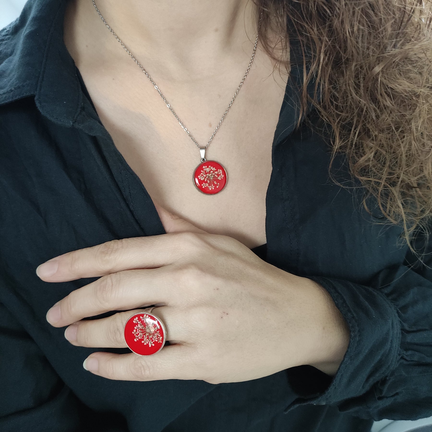 Die Blüten der wilden Möhre wurden von mir gesammelt, getrocknet und handverlesen. Um schön zur Geltung zu kommen, wurden die Blüten auf einem mit rot eingefärbten Hintergrund aus Kunstharz eingegossen.