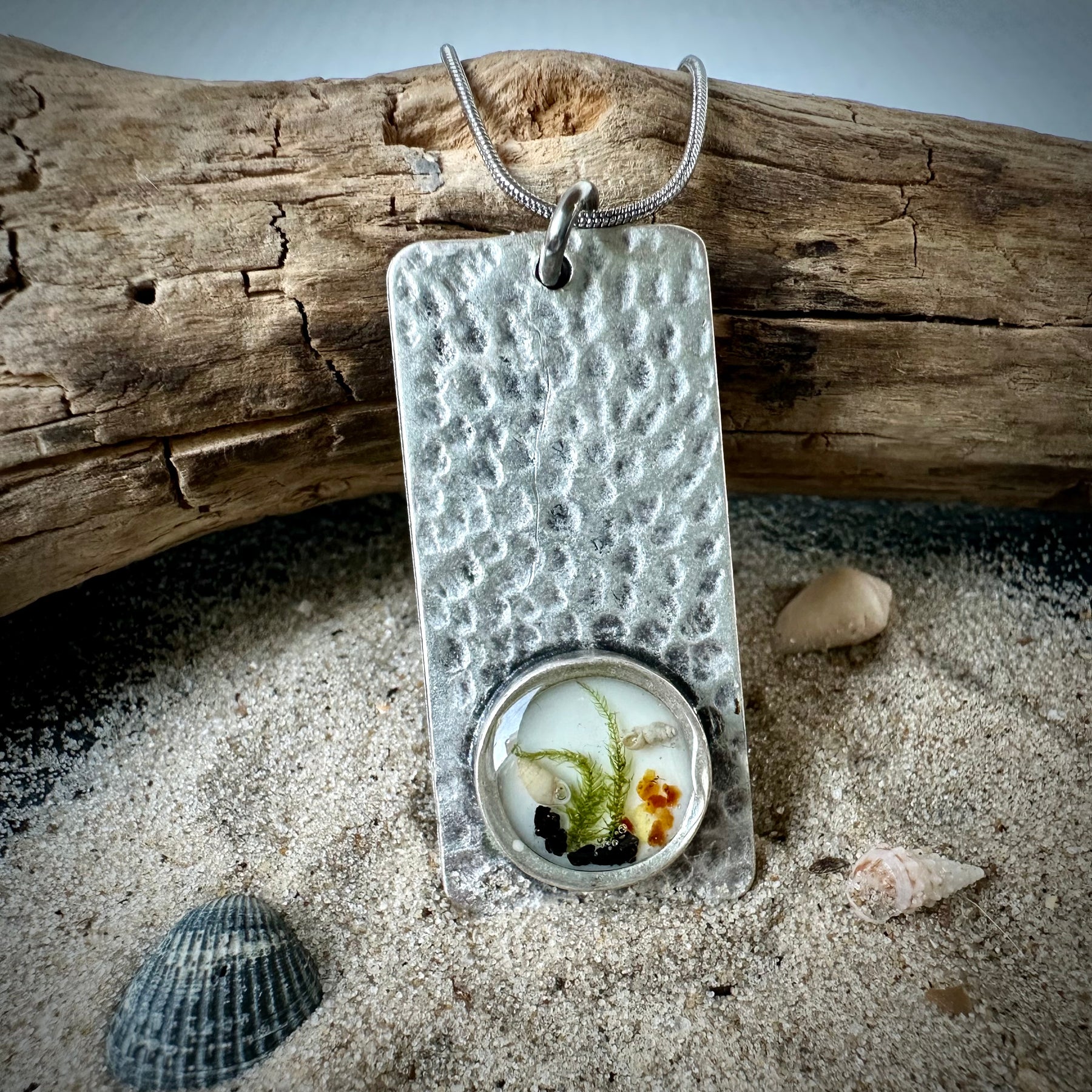 Alle Naturschätze wurden von mir gesammelt, getrocknet und handverlesen. Diese Kette enthält kleine Bernstein-Splitter, Moos, Kleinteile von Schwemmholz und Minimuscheln vom Spiekerooger Strand. Diese kleine Landschaft habe ich in mehreren Schritten sorgsam in Kunstharz verewigt.